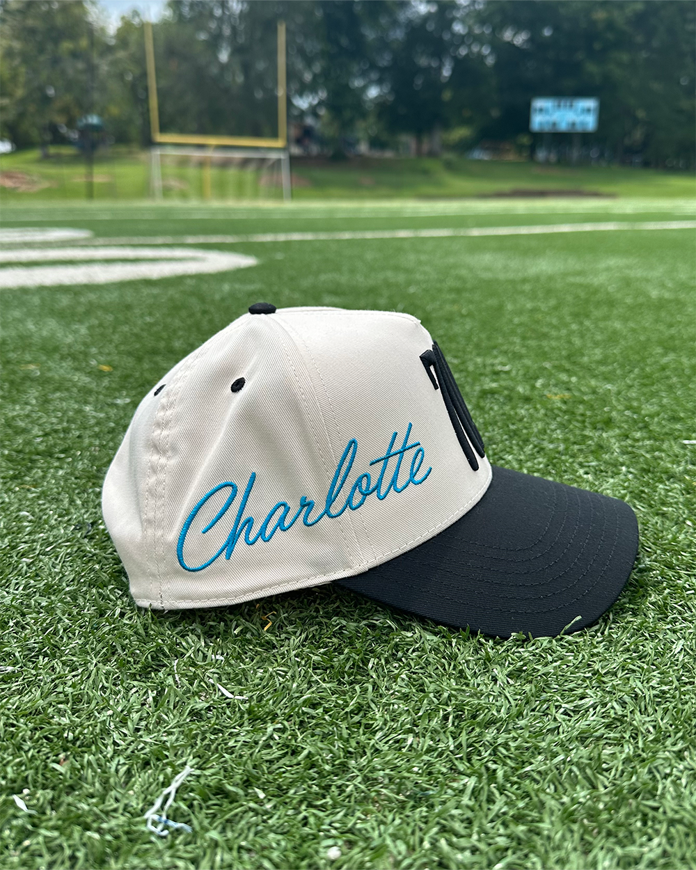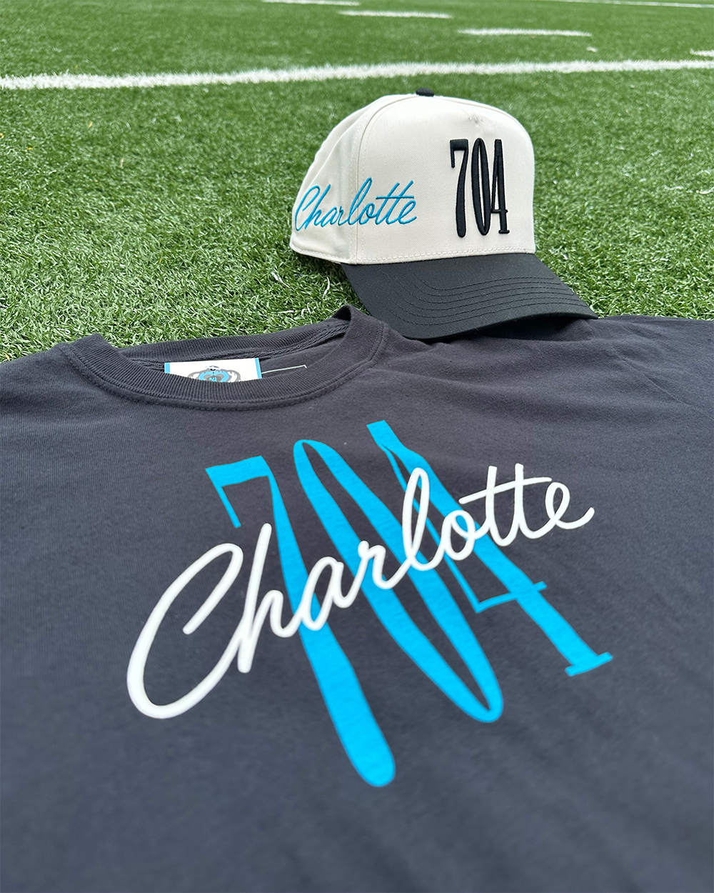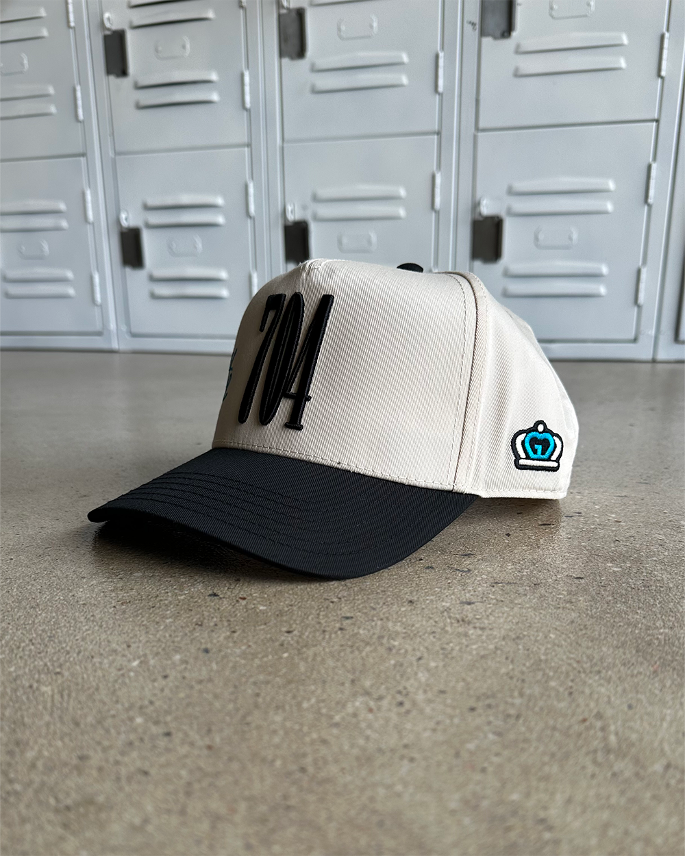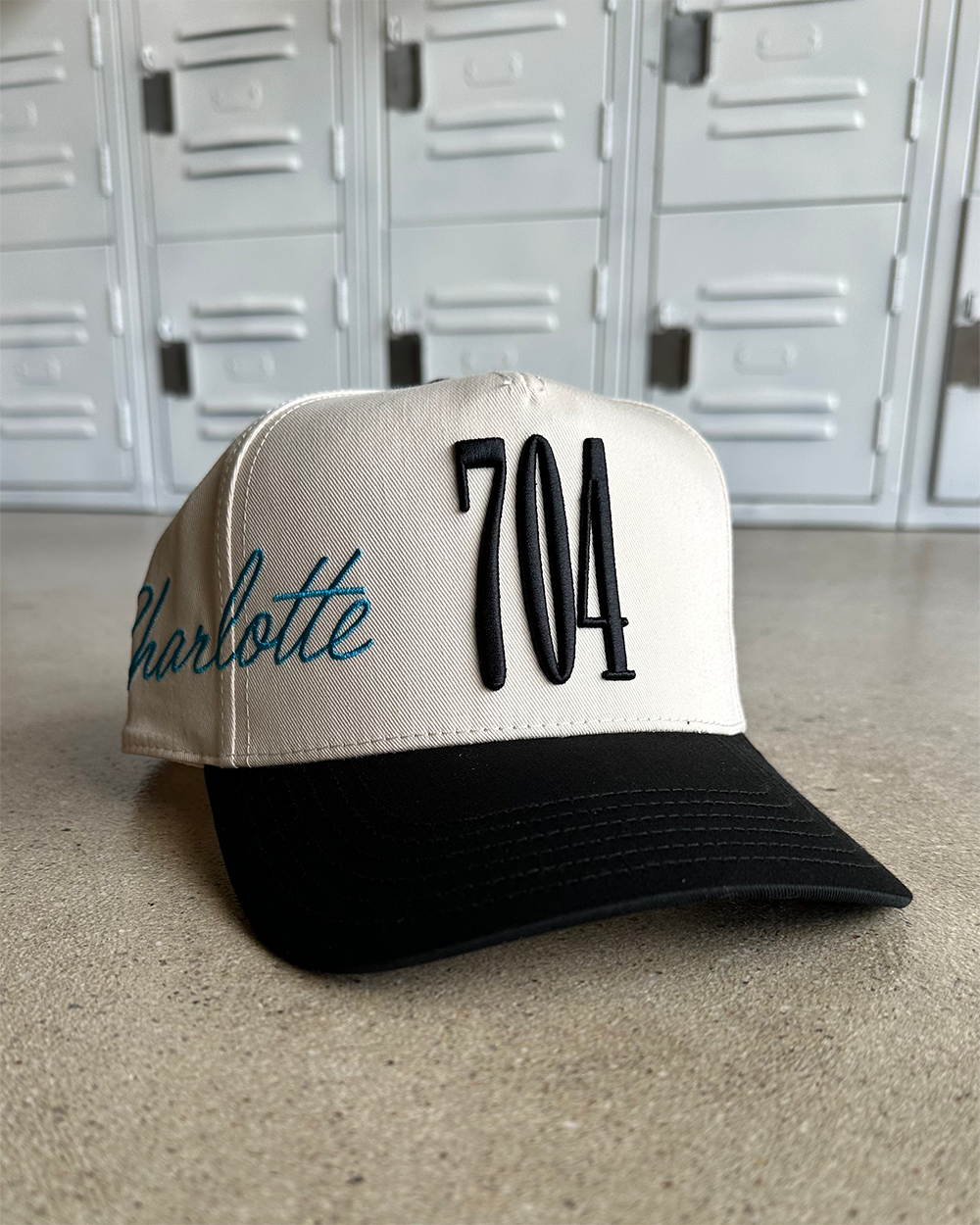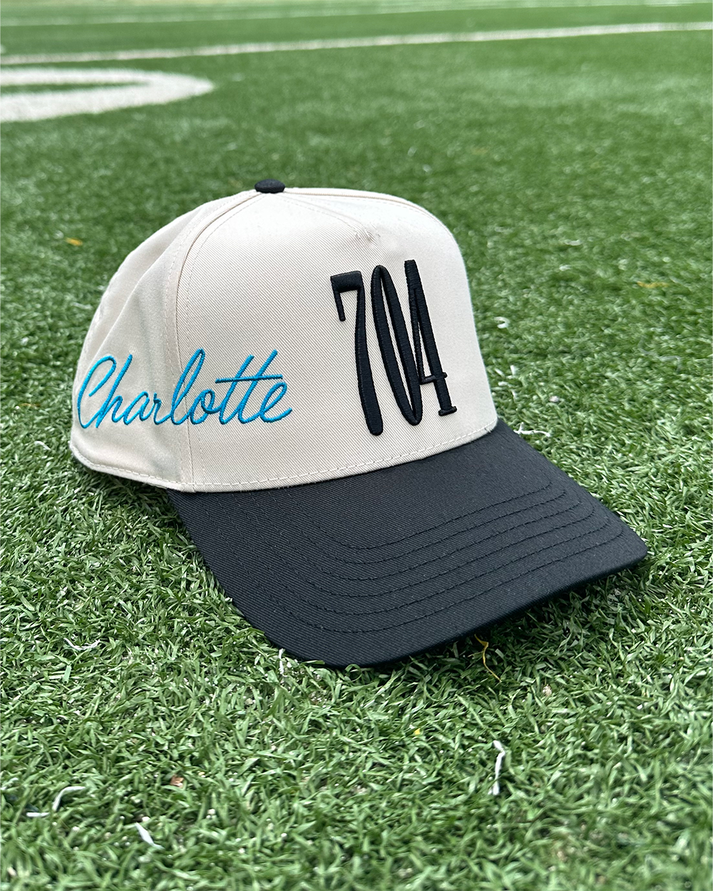 This fully custom created hat features a 3D "704" embroidery on the front while a cursive "Charlotte" wraps around the right side of the hat.? Our logo adorns the left side of the cap.? We didn't stop there though.? Our custom branding is throughout the inside piping and even the tag.